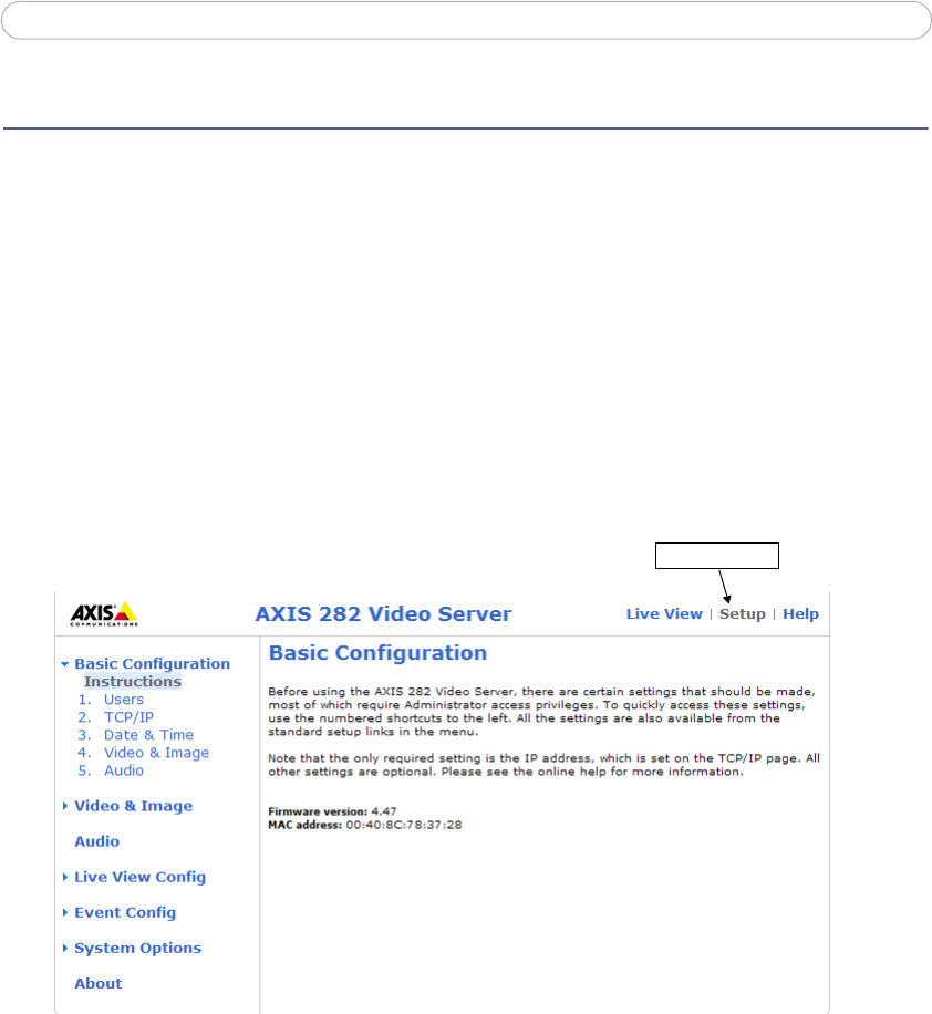 The AXIS 282/AXIS 282A is configured from the Setup link, in a standard browser